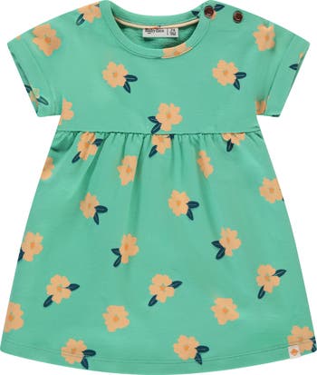 This short sleeve dress features an allover floral illustration print, peplum accent below the bodice, and double button enclosures at the shoulder.