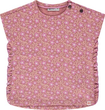 This dusty rose-toned short sleeve top features an allover floral graphic, ruffle accent detailing, and two button enclosures at the shoulder.