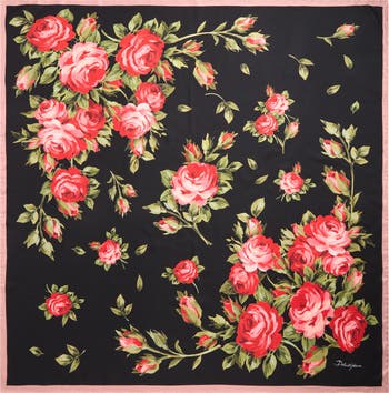 A garden's worth of painterly blooms framed by a contrasting border brings a splash of color to this square scarf made in Italy from lustrous silk twill.