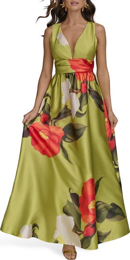 Vibrant flowers further the modern elegance of this flowy satin dress complete with a plunge neckline.