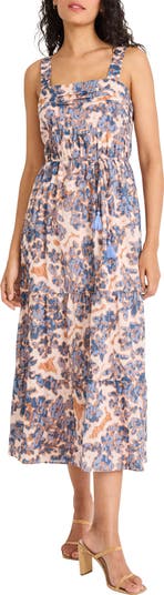 Crisp pleats, tassel ties, and a colorful floral print add extra sweetness to a cotton midi dress constructed with a fitted sleeveless bodice and a flowy A-line skirt.
