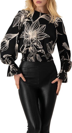A sophisticated long-sleeve blouse adorned with an oversized floral print. Designed with a smocked waistband and cuffs for a flattering fit