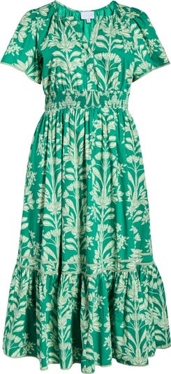 An allover floral print enhances the enchantment of this lightweight maxi framed by puff sleeves and finished with a flouncy frilled skirt.