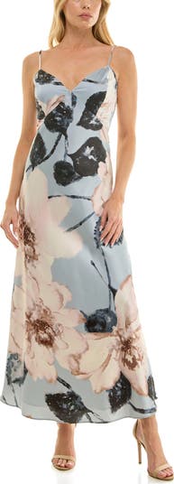 Lustrous stretch satin gracefully skims your shape in this fluid slipdress dappled in a dreamy watercolor garden.