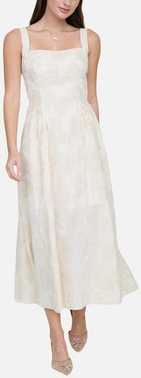 A sophisticated floral jacquard print brings an air of romance to this cotton-blend midi sundress designed with a flattering square neckline and a sculpting basque waist. Adjustable straps and a smocked back provide a flexible fit, while the flowing skirt completes the silhouette.