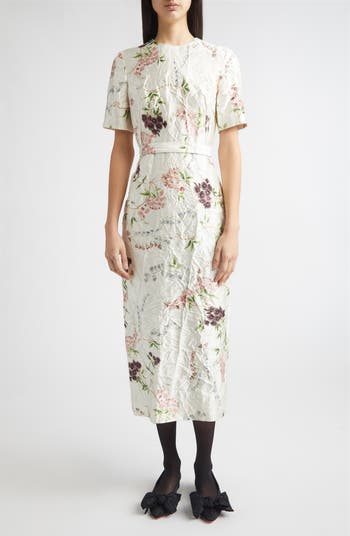 Erdem draws inspiration from the extraordinary figure of Hélène Smith, the late-19th-century Swiss medium who believed she lived past lives, for this pencil dress, particularly her French court incarnation. The lustrous crushed satin becomes a canvas for painterly blossoms inspired by styles worn by Marie Antoinette.
