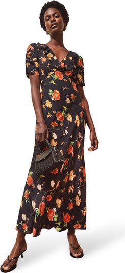 Elevate your style with this bold floral print tie back dress featuring a captivating blend of red and yellow hues. Perfect for making a statement, it's a wardrobe essential.