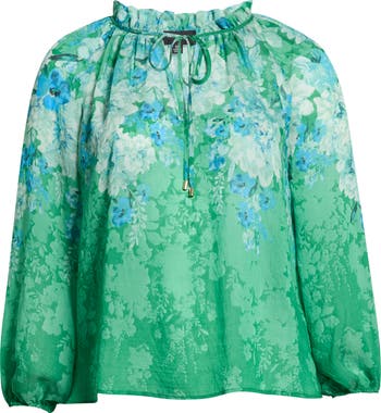 A garden of realistic blooms romance this blousy tie-neck top trimmed with billowy long sleeves and a fanciful frilly collar.