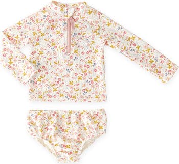 Keep your little one protected on sunny days splashing in the water with this two-piece swimsuit made from UPF 50+ fabric that pairs a long-sleeve rashguard with bloomer bottoms that allow plenty of room for a swim diaper.