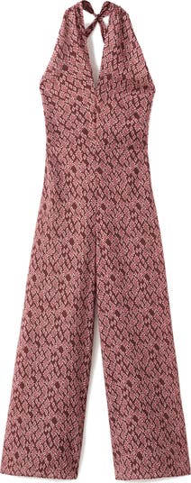 A crisscross halter neckline begins this elegant and stretchy jumpsuit with a flowy wide-leg silhouette and retro-inspired floral print.