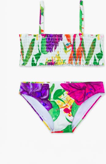A fun tropical printed two piece bikini with stretchy smocking detail and adjustable straps for a comfortable fit