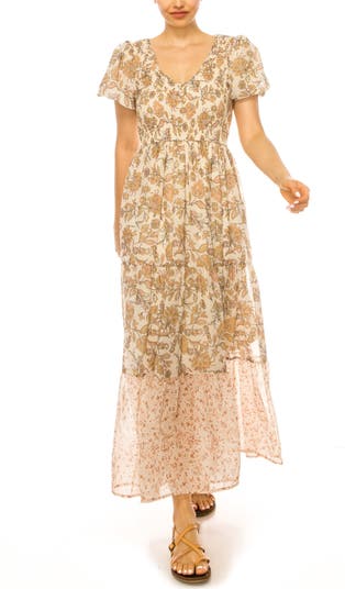 Pretty puff sleeves and a flounced hem enhance the whimsical charm of this floral chiffon maxi dress balancing a smocked bodice with a breezy tiered skirt.