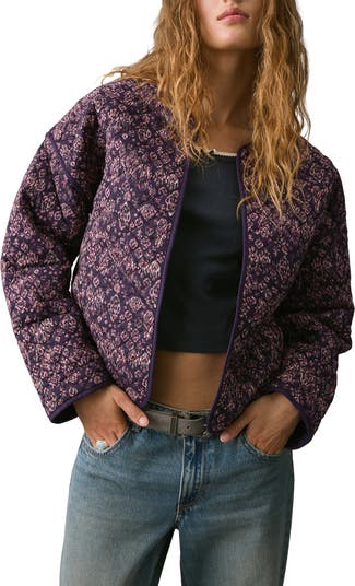 A vintage-inspired floral print textured with small diamond quilting emphasizes the just-thrifted vibe of this boxy jacket cut from fresh, lightweight cotton.