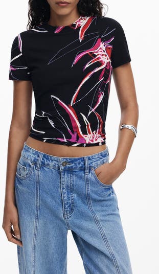 An abstract floral-inspired graphic pops against a black background on this ribbed-to-fit T-shirt imbued with artsy charm.