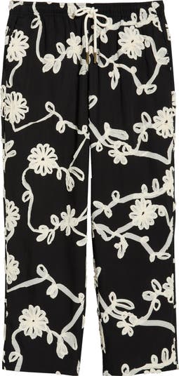 Intricate floral and vine embroidery brings striking detail to these ankle-length pants cut from soft woven fabric. An elastic waistband ensures a flexible fit, while the modern cropped silhouette keeps the look sharp and easy to wear.