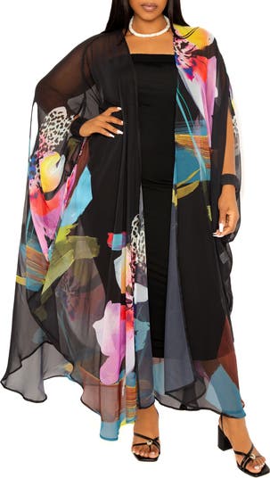 This gracefully moving robe is crafted from luscious chiffon with an enchanting bloom print and wristband details.