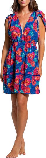 Ruched cap sleeves frame this bright floral cover-up dress featuring a deeply dipped V-back that's secured by delicate ties.
