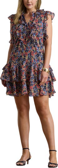 Soft blooms and fluttery, cascading ruffles define this crinkled georgette dress detailed with a slender tie securing the neckline.