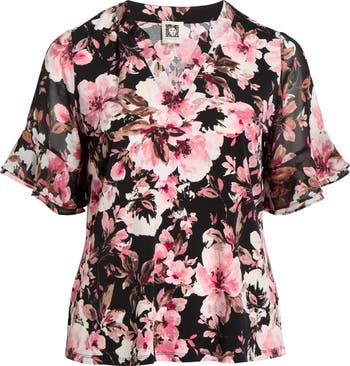 Tumbled in blooms and framed by ruffle-trim elbow-length sleeves, this flowery top works for desk days and drinks dates.
