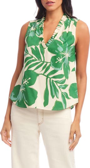 A print of painterly, oversized posies peppers a breathable cotton top finished with a perky ruffle tracing the V-neck.