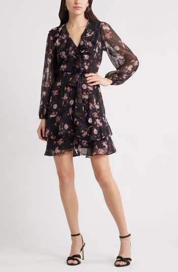 Floral Ruffle Trim Long Sleeve Chiffon Minidress
