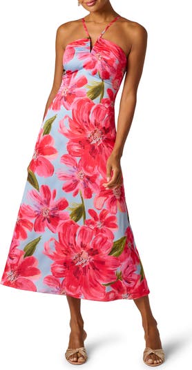 Smooth satin crepe drapes beautifully in this strappy halter maxi dress designed with a flowing A-line silhouette. A notched halter neckline and adjustable straps refine the fit, while the fluid fabric showcases a vivid floral print with elegant movement and shine.