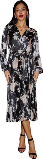 This slinky luxe satin dress is perfect for fancy invites all season long. With a long sleeve, tie waist belt with a wrap over neckline this stunning design oozes elegance, The pleated skirt adds movement to the dress as well as making this super flattering.