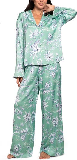 Drift off to dreamland or lounge comfortably in this luxe satin pajama set including a boxy button-up top and wide-leg pants popped with garden-fresh flowers.