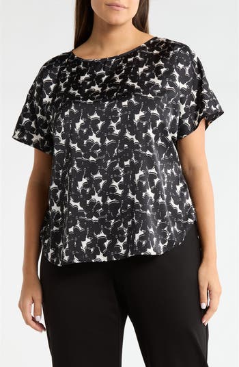 Build out your black-and-white collection with a flower-filled top cut from smooth satin.