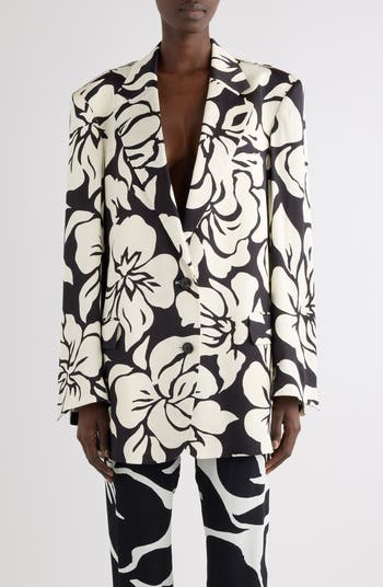An oversized floral pattern is screenprinted onto this richly textured cotton-blend jacquard blazer, bringing bold contrast to the longline style.