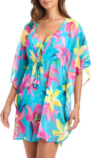 Lounge poolside feeling your most confident in this floral cover-up caftan featuring a cinchable drawstring waist.