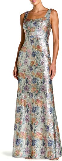 Floral Sequin Sleeveless Square Neck Fitted Gown