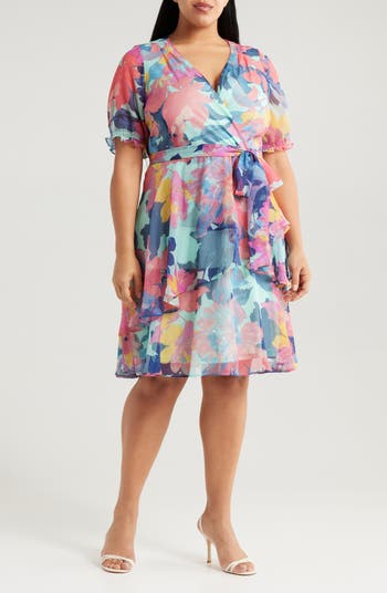 Vibrant blooms punctuate a breezy chiffon fit-and-flare dress fashioned in a faux-wrap silhouette framed by pretty puff sleeves.