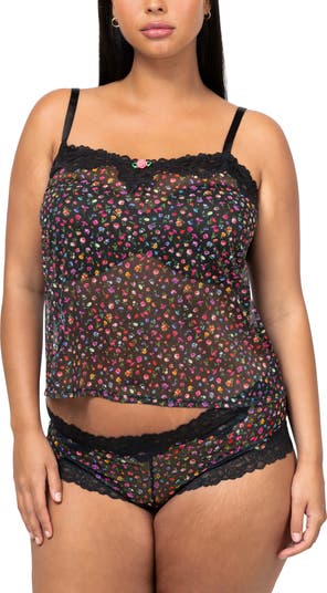 Delicate florals and airy lace bring romantic charm to this lightweight camisole and boyshorts set finished with a sweetheart neckline and scalloped edges.