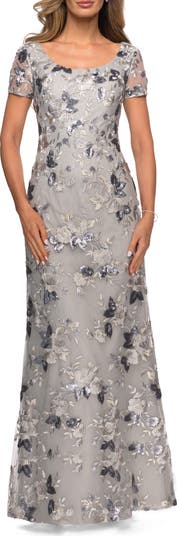 Modern floor length formal floral gown with sheer short sleeves and a flattering scoop neckline. Back zipper closure.
