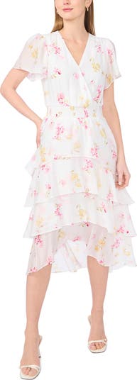 A romantic floral print adorns this dreamy fit-and-flare dress framed by fluttery sleeves and a gracefully tiered skirt.