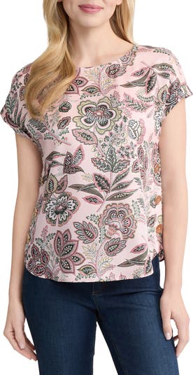 Take your casual look up a notch with the intricate floral pattern that blooms on this cuff-sleeve top that's an easy swap for your stack of go-to crewnecks.