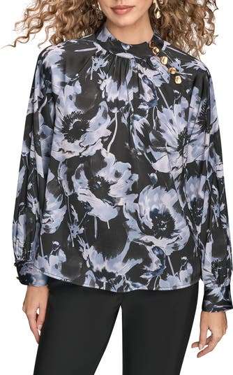 Donna Karan New York Floral Shoulder Button Long Sleeve Top, Alternate, color, Black Temp