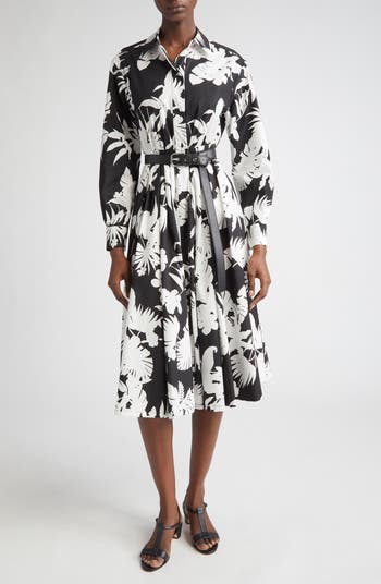 A pleated front adds a shutter effect to the white-on-black floral print patterning this belted shirtdress made from breathable, structured cotton poplin.