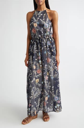Wispy blooms float across this lovely silk chiffon dress tethered at the high neck with delicate spaghetti straps and cinched lightly at the drawstring waist.
