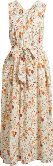 Sun-baked flowers bloom all around a breezy sleeveless midi with a soft gathering at the neck and a shape-enhancing tie belt at the waist.