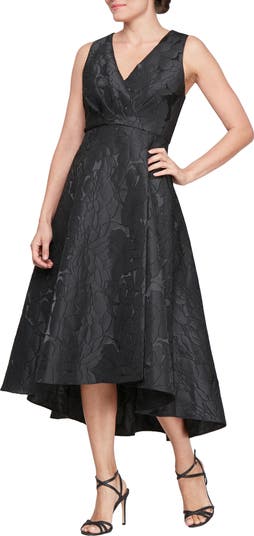 Monochromatic floral detailing adds stunning dimension and enriches the classic romance of this graceful A-line gown framed by a gathered surplice V-neck and subtle high-low hem.