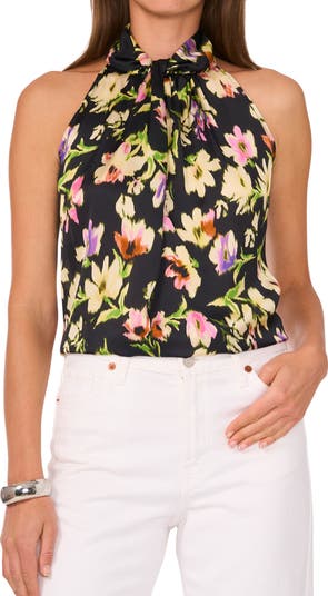 Brushstroked blooms animate a summery top designed with a high neck and a shoulder-showcasing silhouette.
