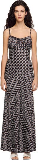 Floaty, lingerie-style printed maxi dress with straps and a lace-up back.