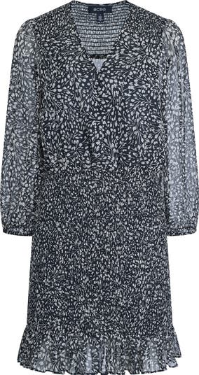 Smocking at the shoulders and skirt creates a curve-hugging fit on this chiffon minidress framed by billowy sleeves and versatile enough for the boardroom or post-work drinks.