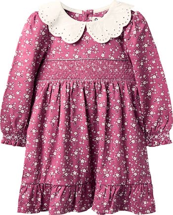 Eyelet embroidery decorates the scalloped collar of a darling cotton dress featuring a smocked panel, floral print and ruffle hem.