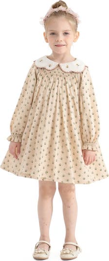 A vintage-inspired favorite with delicate details and all-day comfort. This long-sleeved dress features soft green florals on a beige base, a scalloped white Peter Pan collar with embroidered accents, and a smocked bodice that adds texture and charm. The flowing silhouette and elasticized cuffs make it perfect for twirling, strolling, or dressing up for special moments. Embroidered scalloped collar adds a sweet, handcrafted touch. Smocked bodice and gathered sleeves offer comfort with timeless style.