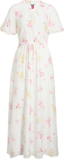 A split neckline and drawstring waist bring relaxed everyday ease to this floral maxi dress framed by voluminous bubble sleeves.