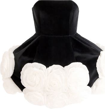 This striking gown blends timeless elegance with avant-garde artistry. The strapless bodice flows into a voluminous skirt, dramatically adorned with oversized floral appliqués that resemble sculpted roses. The bold contrast creates a captivating silhouette, perfect for high-fashion events or editorial showcases