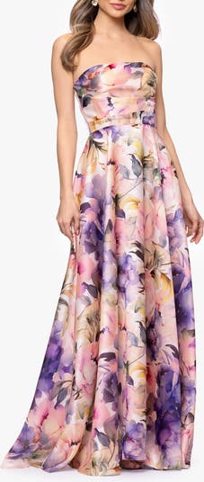 Bring the garden to the party in a swishy strapless dress tumbled in brushstroked blooms.